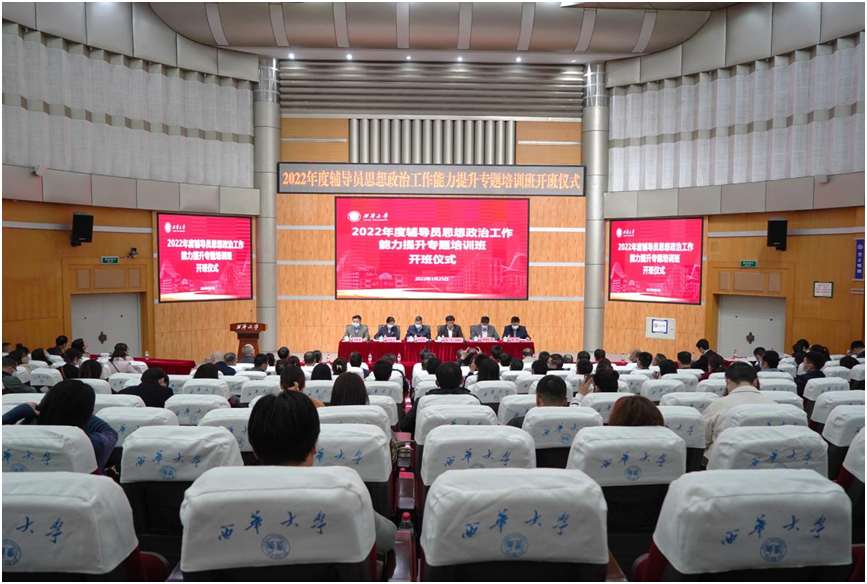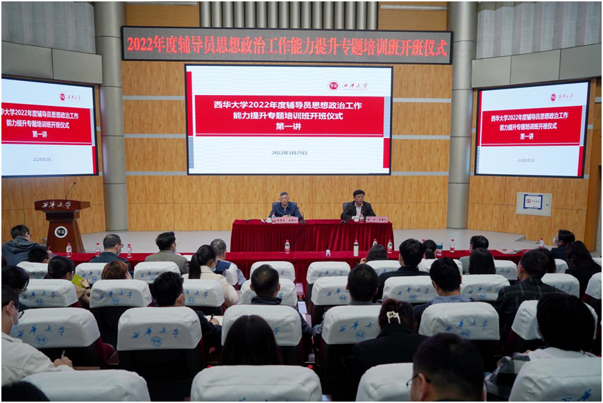 3月25日下午,西华大学2022年度辅导员思想政治工作能力提升专题培训班开班仪式暨首讲在四教报告厅举行。校党委书记、党校校长余孝其出席开班仪式并讲话,相关职能部门负责人、各党(工)委(党总支)书记、研究生工作部、各学院分管学生工作负责人、全体专职辅导员、学生工作部全体人员参加开班仪式,宜宾校区通过直播观看开班仪式。开班仪式由校党委副书记、党校常务副校长张力主持。