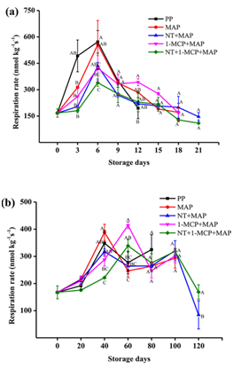 Fig.3 Respiration rates ofthe PP (PP box-packed), MAP (MA-packed), NT+MAP (MA-packed after NT treatment),1-MCP+MAP (MA-packed after 1-MCP treatment), and NT+1-MCP+MAP (MA-packed after1-MCP and NT treatment) plums stored at 25 ℃ (a) and 4 ℃ (b).