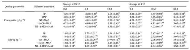 Table 1 The variation in the protopectin and water-soluble pectin (WSP) content of the plums, resulting from different treatments during storage at 25 ℃ and 4 ℃.