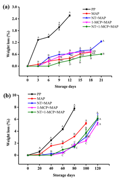 Fig.4 Weight loss of thePP (PP box-packed), MAP (MA-packed), NT+MAP (MA-packed after NT treatment),1-MCP+MAP (MA-packed after 1-MCP treatment), and NT+1-MCP+MAP (MA-packed after1-MCP and NT treatment) plums stored at 25 ℃ (a) and 4 ℃ (b).