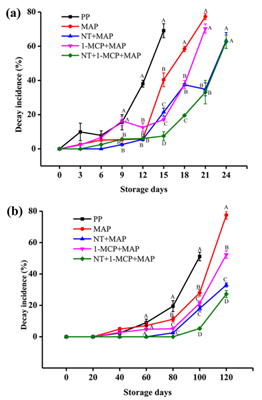 Fig.1 Decay incidence of the PP (PP box-packed), MAP (MA-packed), NT+MAP(MA-packed after NT treatment),1-MCP+MAP (MA-packed after 1-MCP treatment), and NT+1-MCP+MAP (MA-packed after1-MCP and NT treatment) plums stored at 25 ℃ (a) and 4 ℃ (b).