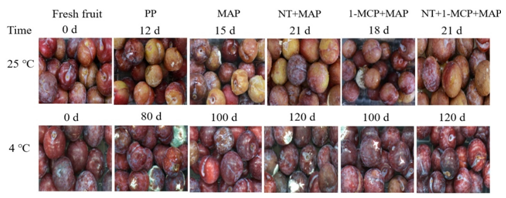 MAP可以防止或延缓水果衰老以及相关的生理变化,达到延长多种果蔬贮藏期的目的。纳他霉素(NT)作为抑菌剂在食品工业中被广泛使用,以防止霉菌和酵母污染。据我们所知,目前还没有关于NT在控制李子采后质量变化方面的有效信息。应用1-MCP和MAP调节李子贮藏期间的生理学变化已被广泛研究。然而,对1-MCP和MAP的研究主要集中在单一处理上,而目前综合处理的应用较少。此外,NT在李子保鲜中的应用鲜有报道。因此,本研究探讨了抑菌剂(NT)结合1-MCP与MAP(NT+1-MCP+MAP)对李子在贮藏期间品质特性和生物活性化合物的影响,并开发了一种可用于延长李子采后货架期的综合保鲜方法。