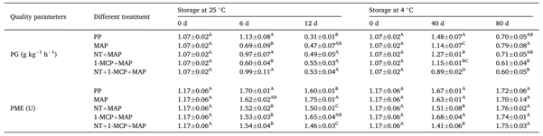 Table 2 The variation in the polygalacturonase (PG) and pectin methylesterase (PME) activity of the plums,resulting from different treatments during storage at 25 ℃ and 4 ℃.