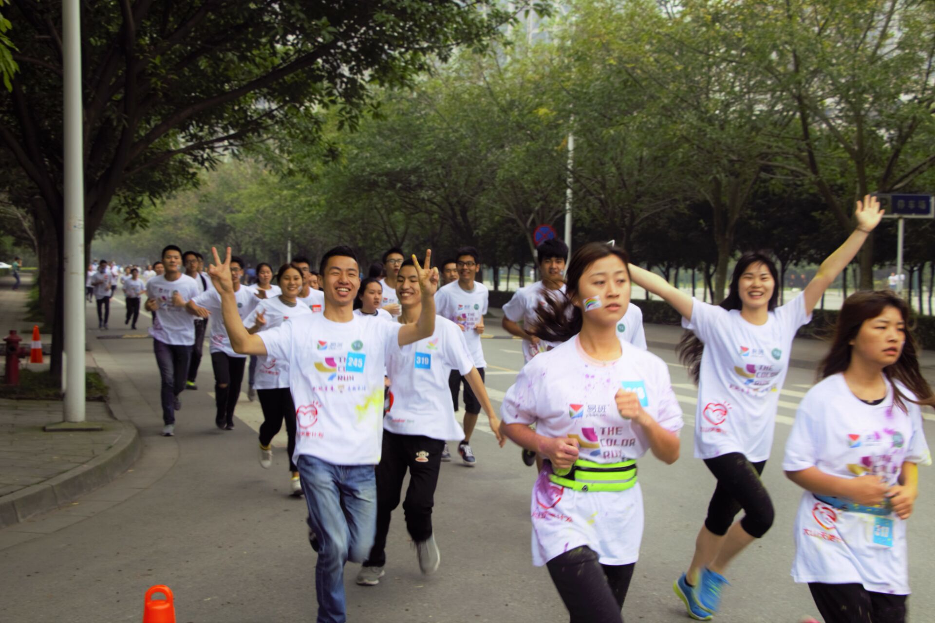 个人赛以明德广场为起点,沿一食堂->西华苑->四食堂->七教->六教的路线,最后回到明德广场,途中有四个工作点,当参赛人员经过时,工作人员将向他们撒上彩粉,寓意着对运动的热爱,对青春的活力展示。而团队赛将以团队素质拓展的形式,在跑步过程中前往指定的游戏地点完成游戏,最后返回明德广场进行签名和彩粉合影留念。为了防止跑步过程中突发情况,校园院的医务人员也积极配合,随时做好应急准备。 仅仅过了十几分钟,陆陆续续就有“彩人”向最后一个工作点跑来,衣服已不见了最初的模样,被工作人员撒上彩粉后更具一份靓丽。汗水伴随着声声喘息声流下,抬着些许乏累的脚步坚持向终点跑去,每一个即将到达终点的选手都没有选择停下。顶着头上的“彩发”,“画”在脸上的彩妆,披在身上的“彩衣”坚持奔跑,是他们对运动的一份坚持,对青春的一份展示。或许旅途很累,但终点的胜利足以让人收获喜悦。“一口气跑下五公里确实很累,但对于大三的我来说,是一个走出寝室锻炼的好机会。”来自电气与电子信息学院的何韵同学跑完赛程欣慰地说。在到达终点的人群中,有一个特殊的身影——学生工作部副部长王强。当被问到参与彩虹跑的原因时,他说:“我想和同学们一起运动,感受其中的快乐。”而谈到举行易班彩虹跑的意义时,他说:“一方面是易班的周年庆,另一方面则是希望同学们在奔跑中强健身体,在长跑中锻炼意志,在快乐运动中收获正能量。”