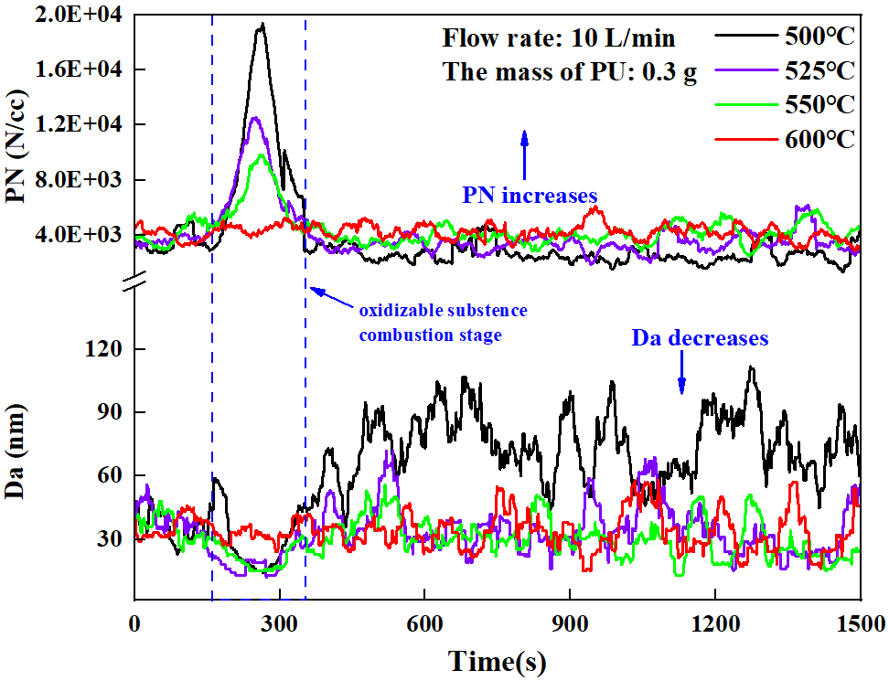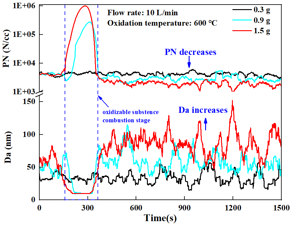 Figure 1. Particle diameter concentration distribution diagram at different oxidation temperatures (heating oxidation stage)