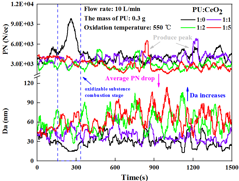 为探究DPF再生时颗粒的来源以及DPF再生性能的优化措施,团队采用模拟碳黑颗粒PU研究了不同再生温度、碳载量以及催化剂和灰的比例对其氧化性能以及排放性能的影响,研究结果表明,再生温度越高,气体和颗粒排放量越多,小粒径颗粒生成增加;碳载量增加会降低再生效率,促使大粒径颗粒产生;加入催化剂CeO2和活性灰ZnO可以有效降低CO的产生以及颗粒物的产生,促进再生,并且促使大颗粒物生成,为控制23nm颗粒的排放提供理论研究基础。