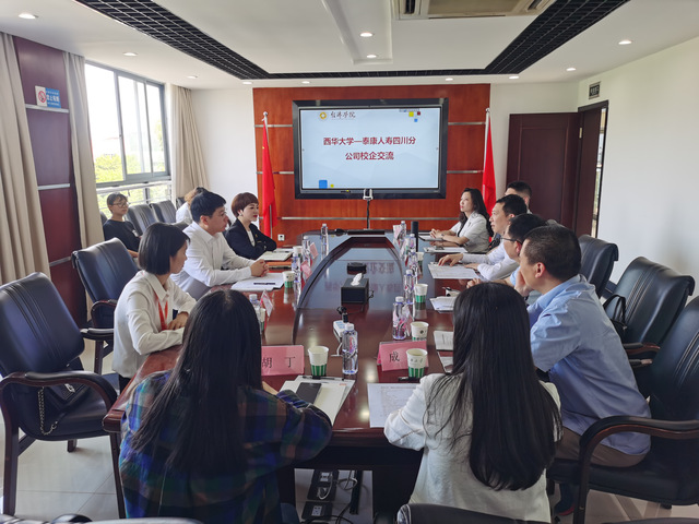 4月26日下午,西华大学与泰康人寿四川分公司校企合作交流会在行政楼413会议室举行。泰康人寿四川分公司总经理韩凤旭、高级客户部经理黄冬梅、人力资源部经理黎永波及高级专家徐剑云一行来校洽谈合作事宜,副校长郑鈜,经济学院党委书记邱刚、院长罗航,学院党委副书记易宇峰,副院长程盈莹、副院长成欢及教师代表胡丁出席了此次交流会,双方就“泰康班”开班、产教融合教学等方面工作开展校企合作交流,会议由经济学院院长罗航主持。