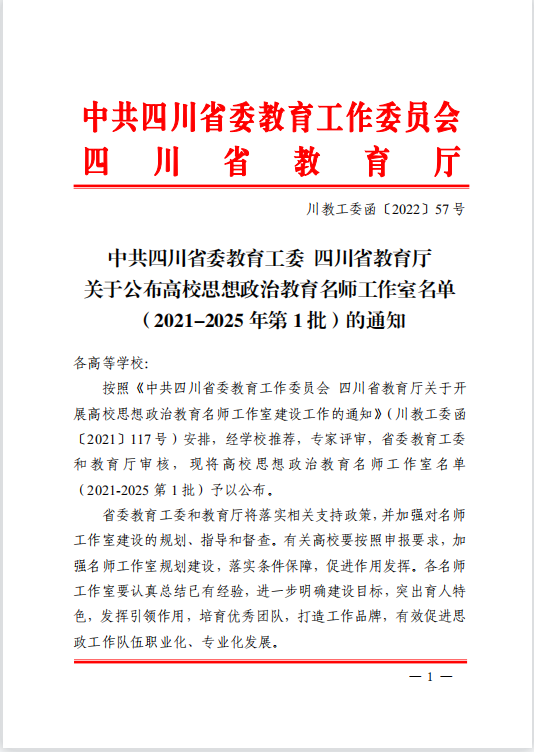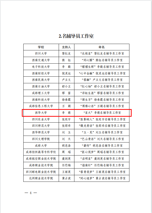 近日,中共四川省委教育工委、四川省教育厅公布了高校思想政治教育名师工作室名单(2021-2025年第1批),我校辅导员李萌申报的“星火”李萌名辅导员工作室成功入选。