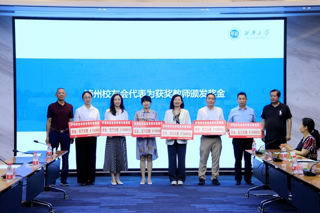 李秋实宣读了《关于表彰西华大学2021年“泸州校友会优秀青年教师奖励基金”获得者的决定》,建筑与土木工程学院刘钢、汽车与交通学院韩志强、电气与电子信息学院王涛、食品与生物工程学院饶瑜、法学与社会学学院陈珊、文学与新闻传播学院饶冬梅等6位青年教师获得奖励基金。费凌、刘小兵、李秋实为获奖教师颁发荣誉证书,梁智明、封晓川为获奖教师颁发奖金。