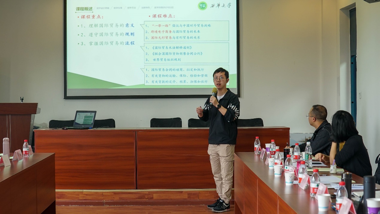 省级一流课程《国际贸易实务》负责人经济学院副教授左世翔做了《以学生为中心的国际贸易务一流课程建设与改革》的报告,介绍了在课程建设中落实“学为中心、三位一体”的教学设计。从传统课堂面临的问题、混合式翻转课堂的优势进行学情分析,重构课程的育人价值,积极引导学生认识与参与“一带一路”倡议,形成了线上线下混合式“九节点”教学流程及教学改革思路,并以此指导了课程教学的实施与评价。