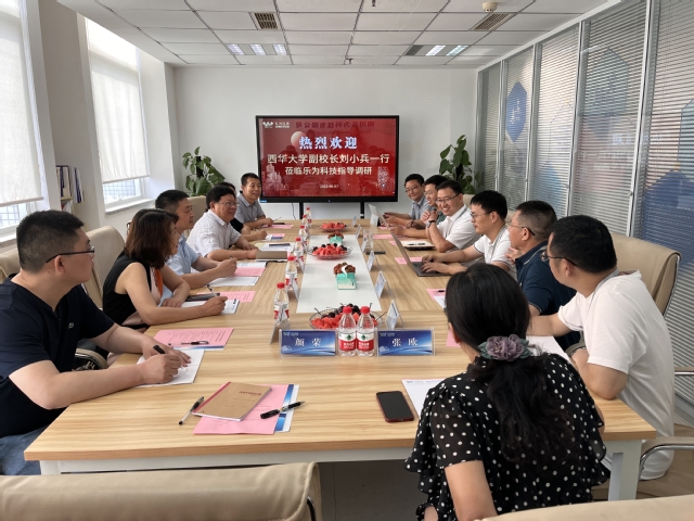 刘小兵一行在苏方红校友的带领下参观了公司,了解公司发展理念、发展现状、技术优势、产品功能等情况。随后,双方在会议室进行了交流座谈,会议由四川乐为科技有限公司董事长助理谢尚书主持。刘小兵从办学规模、招生就业、发展规划等方面简要介绍了学校近年来的发展情况。他谈到,自2009年以来,苏方红校友就和几位校友一起在理学院、计算机与软件工程学院设立 “勤奋谦卑”助学金,每年为经济困难的学弟学妹提供经济资助;捐赠数据存储相关设备;为四川省军民融合协同创新中心捐赠建设资金;为“校友杯”创新创业大赛捐赠奖金;到学校扶贫点慰问困难群众并发放慰问金等,近几年,苏方红校友和四川乐为科技有限公司为西华大学捐赠物资及现金共计140余万元。