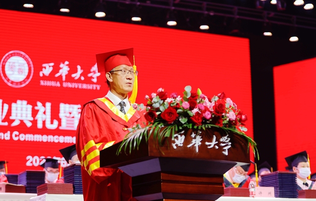 校学位评定委员会主席、校长刘树根以《求是明德心向党 追求卓越启新程》为题,向全体毕业生送上临别寄语和真挚祝福,与同学们分享了几年来党和国家发展历程中的大事要事及学校改革发展取得的显著成绩,对同学们在西华求学期间不懈努力、全方位成长所取得的成绩表示肯定和祝贺。