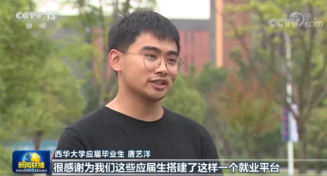 6月19日,我校宜宾校区应届毕业生唐艺洋同学接受央视记者采访的画面,出现在《新闻联播》的《沿着总书记的足迹,新时代治蜀兴川再上新台阶》中。他在采访中说“很感谢为我们这些应届生搭建了这样一个就业平台。下一步,我会按照总书记勉励我们青年学子所说的那样,要热爱劳动,脚踏实地,在实践中一步步成长起来,努力做一个德智体美劳全面发展的人。”