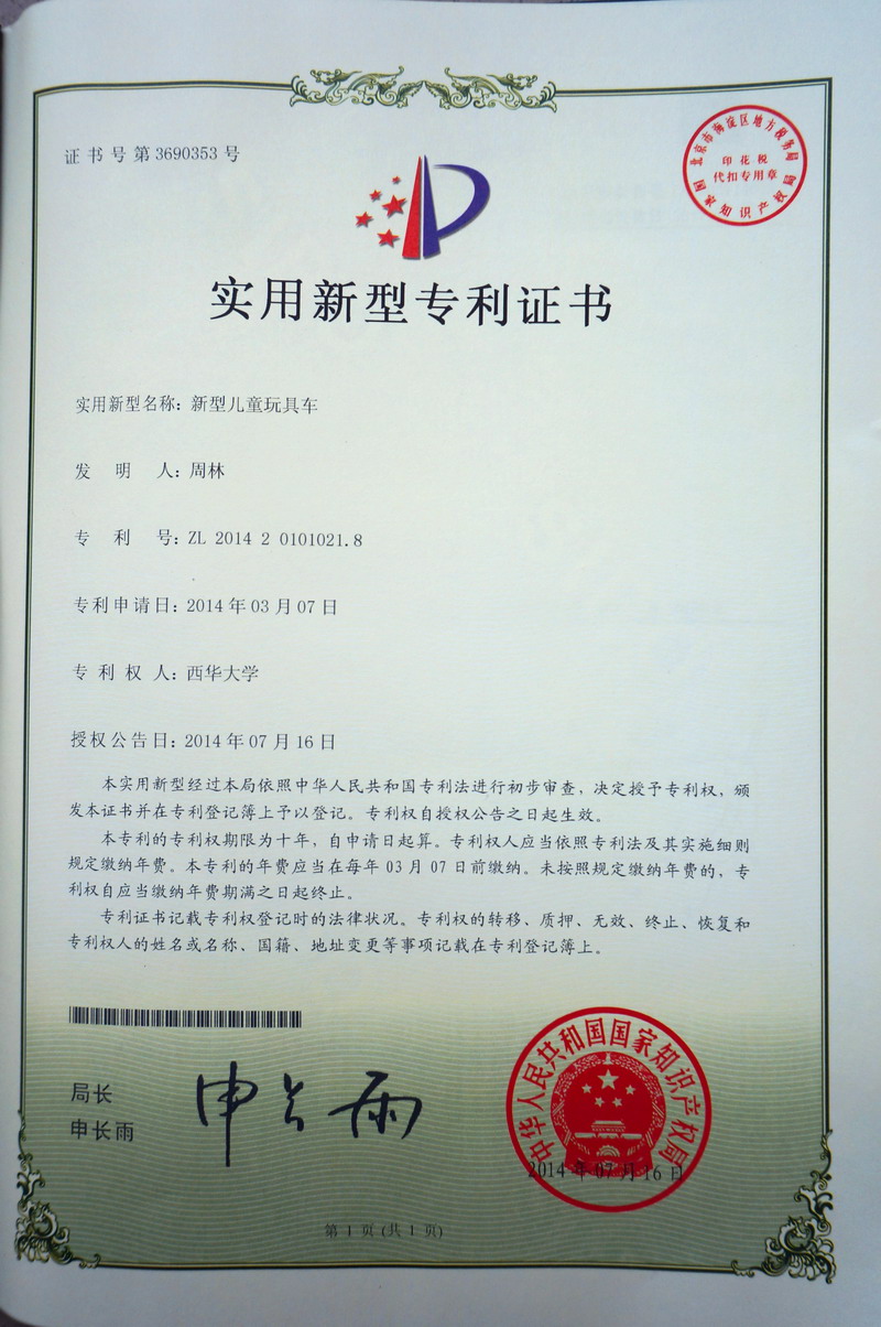 近日,西华大学人文学院2012级学前教育专业的周林同学发明的“新型儿童玩具车”获得国家实用新型专利。 实用新型专利又称小发明或小专利,是专利权的客体,是专利法保护的对象,是指依法应授予专利权的实用新型。实用新型通常是指对产品的形状、构造或者其结合所提出的适于实用的新的技术方案。该实用专利是一种新型儿童玩具车,它的发明设计思路是:以节俭和环保为立足点,玩具车的主板和侧板以木质材料为主,有利于解决现实中的儿童玩具重金属含量超标和废弃玩具的环境污染问题。新型儿童玩具车可以通过固定轮内的锁孔固定装置与锁孔及时的改变玩具车的结构,改进了玩具车的功能,从而大大地提高了玩具车整体的使用寿命和安全性。除此之外,新型玩具车的改装重组功能,较好地满足了不同阶段儿童的发展需要。 为获得国家实用新型专利,周林同学作了大量的前期准备工作,实地走访、调查目前的儿童玩具车市场,分析各种儿童玩具车设计的特点,进行专利设计,等等。在此过程中,周林同学遇到不少难题,也得到了他的专业老师的指导。他在与同学的交流分享中说道:“以灵感为种,用脚踏实地、坚持不懈的态度做土,将专利的设计和申请视为孕育种子的过程,以老师、同学的支持和帮助作为雨露和阳光,虽然孕育的过程有些艰辛漫长,但是只要细心呵护、朝耕暮耘,终究能收获丰硕的果实。” 近年来,人文学院高度重视学生专利的申报工作,着力营造“崇尚科学”的大学文化氛围,鼓励同学们利用课余时间根据自己所学的知识进行创新创造,把创新带进课堂,激发了学生科学研究和科技创新的热情,让同学们在发明创造中找到了自己的兴趣,并将这种兴趣和学习相结合,在实践中去应用,体会学习的乐趣和价值。人文社科类的学生获得国家专利在我校不是偶然,也不是个案,此前人文学院就有学生获得国家实用新型专利。