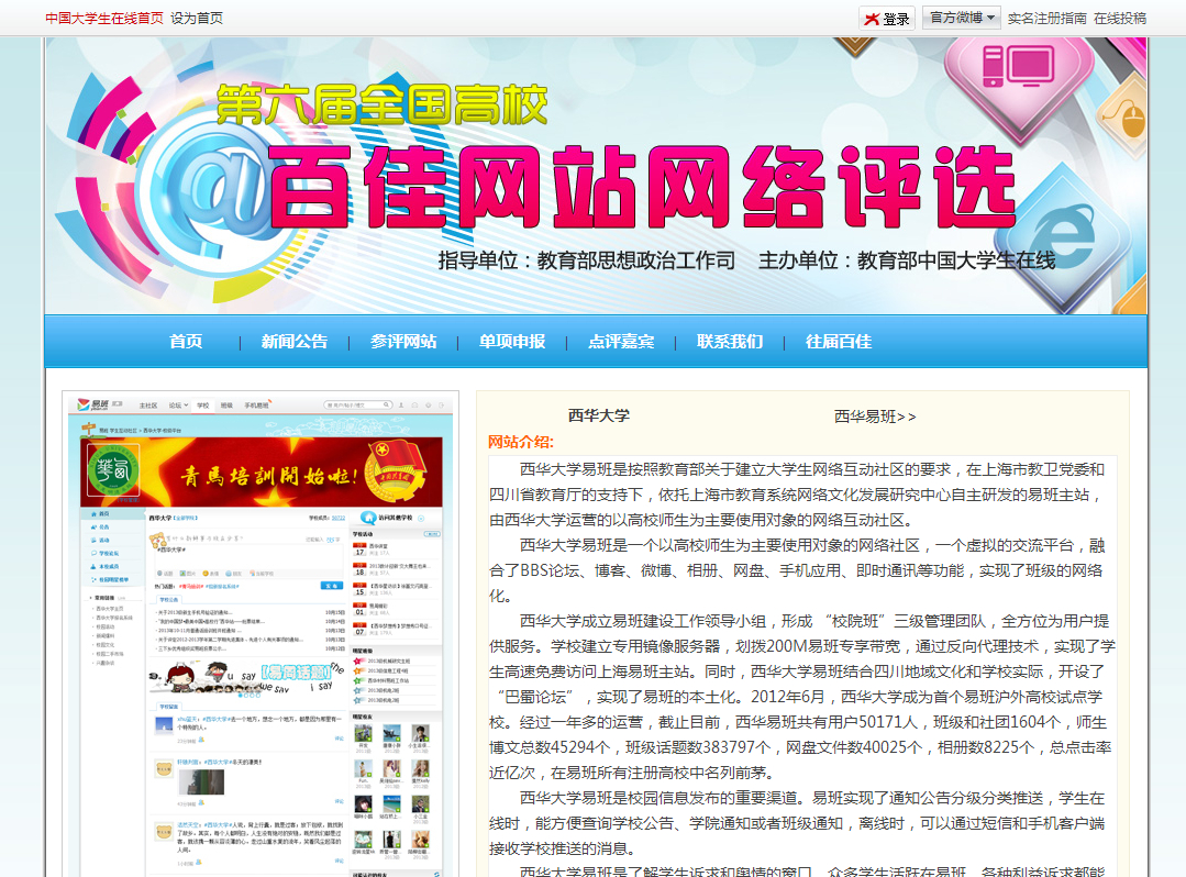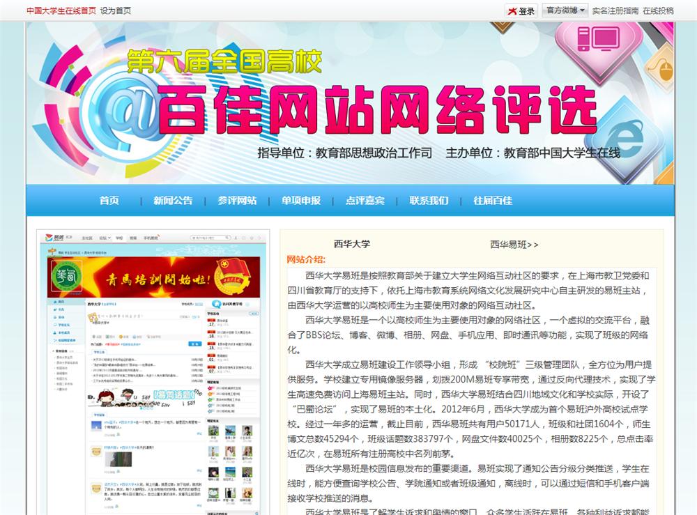 近日,由教育部主办、教育部中国大学生在线承办的第六届“全国高校百佳网站”名单揭晓。西华大学易班网站榜上有名,获得“全国高校百佳网站”称号,并入围全国13个单项最佳奖之一的“最佳网络社区奖”。这是继2013年西华大学新闻网入选“全国高校百佳网站”之后,我校易班网站再次获此殊荣。 本次评选从2013年9月持续到2014年1月,全国27个省、市、自治区和直辖市的数百所高校参加角逐,经线上申报、各网站展示、建设和完善,网民线上投票,网站线上入围、网站线上提名、线下终评等多个环节,产生最终百佳名单。四川省共有14所高校的网站参赛,最终仅有5所高校的网站获此殊荣。 西华大学易班建设成效显著,受到各方好评。百佳网站评委、天津大学的王寒老师这样评价西华易班网:“西华大学易班网独具特色,是一个人文气息浓重的大学生社区平台,创意独具,想法新颖,各个同学和学生社团都可以在网站上各抒己见,交流感情。整个网站充满着青春洋溢的气息,值得其他学校效仿。” 百佳网站评委、中国矿业大学的龚成老师说:“该网页极具创新意义,与众不同,以论坛的形式来做网页增加了可读性与浏览性,图片的完美搭配更为此增加了不少意蕴,整体上是很不错的。” 同时,我校申报的《建设西华大学易班构筑校园网络文化新家园》荣获2013年四川省高校校园文化建设优秀成果二等奖;易班学生工作站被上海易班发展中心授予2013年度“十佳易班工作站”荣誉称号;在西华大学2013年年终考核评优中,西华易班因“建设有力推进,示范效应明显”获得学校“突出贡献奖”。2013年11月,由教育部思政司主持召开的易班推进工作会在我校召开。会上,我校被授予“易班建设示范基地”。 据悉,全国高校百佳网站评选自2006年开始,已成功举办六届,被誉为全国高校网站评选的“百花奖”,活动受到全国高校及社会的广泛重视和关注,成为中国高校的网络盛事,也是展现各高校风采的窗口、服务大学生成长成才的平台。 |