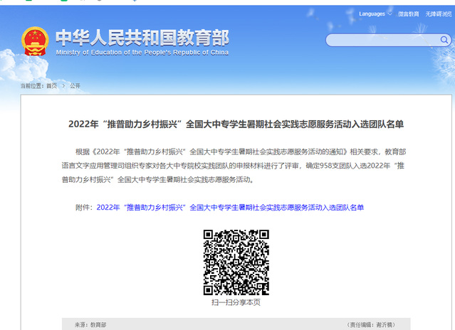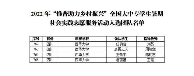 近日,教育部公布了2022年“推普助力乡村振兴”全国大中专学生暑期社会实践志愿服务活动入选团队名单,我校有4支团队成功入选,数量位居全省高校第四位。
