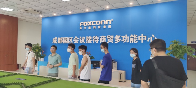 富士康人力资源部专理谭蓉、专员郭家成带领同学们参观科技园,并从产业布局、园区环境、文化建设等方面为同学们详细介绍了科技园的相关情况。富士康资深工程师王猛带领同学们前往生产车间参观并为同学们作了详细介绍。富士康成都科技园自2015年开始逐步建立多达600余位专业人才的工业互联网团队,以OT+IT的工作方式,采用混合现实(MR)、人工智能(AI)和物联网(IoT)等技术,使劳动效率提高了200%,设备综合效率提高了17%,实现从“工匠”向“智匠”变革,成功建设成为卓越运营的“无忧”工厂,为国际所认可,于2021年3月入选世界经济论坛“灯塔工厂”名单。