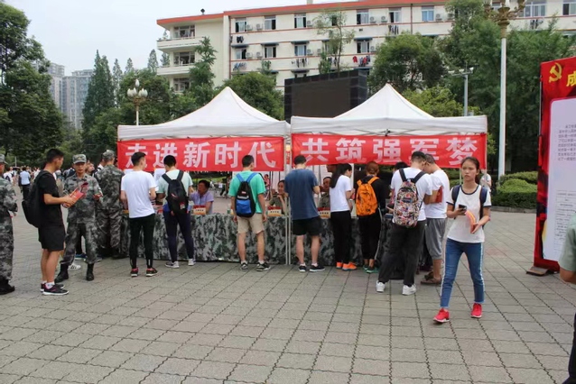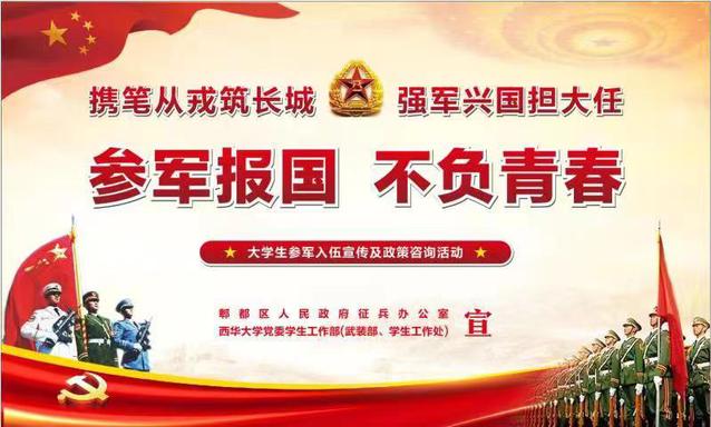 学校充分利用线上、线下积极向学生介绍征兵要求、条件和政策。学校党委武装部在国防教育的基础上,征兵动员宣传方式多样化。多次派员到成都警备司令部、金牛区武装部、金牛区公安局、社区街道办参加征兵工作培训、学习。与其他大学征兵、街道征兵办等兄弟单位交流,提高各级各类征兵工作人员的素质。加大征兵工作的宣传力度,采取线上线下结合,学校门户网站、易班、学生热点论坛、QQ群、微信群、征兵海报、标语、展板、制作大学生入伍宣传册、宣传片和征兵主题班会等多种渠道,宣传大学生入伍、选用培养、复学升学、就业服务、应征条件优待政策等相关法规,树立当兵光荣的先进思想,鼓励投笔从戎,当兵为国奉献,激励大学生入伍积极性。