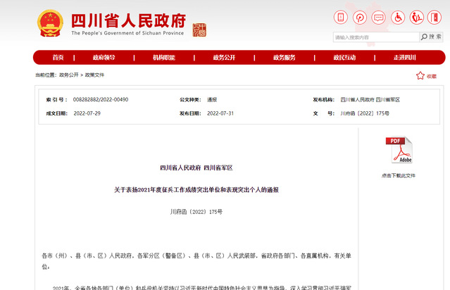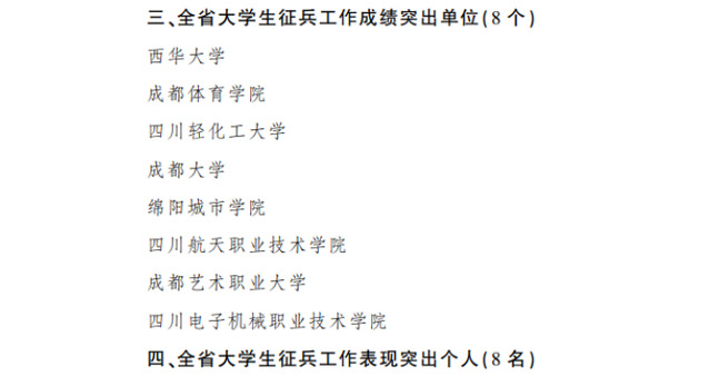 7月31日,四川省人民政府网发布了《关于表扬2021年度征兵工作成绩突出单位和表现突出个人的通报》,决定对20个单位和36名个人予以通报表扬。西华大学、成都体育学院等8所高校获“全省大学生征兵工作成绩突出单位”荣誉称号。