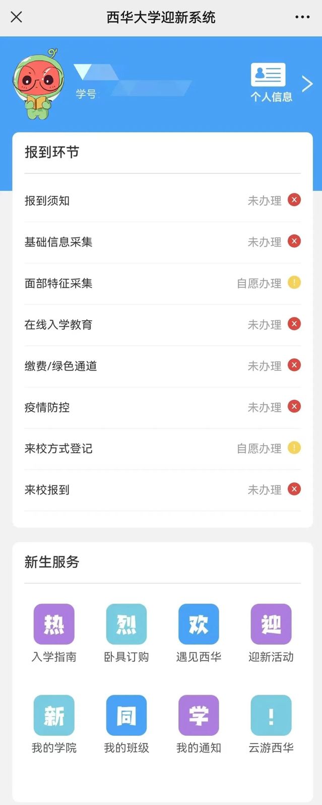 按照学校的部署,8月5日起,新生们收到录取通知书后,关注“西华易班”公众号就可填报个人基础信息了,完成身份认证后立即可以参加线上入学教育,采集面部特征。在“新生服务”板块,新生可以查看“入学指南”,订购卧具;点击“遇见西华”板块,可以了解校园攻略,参加线上入学教育和“青春献礼二十大,强国有我新征程”新生主题教育等系列易班迎新活动。