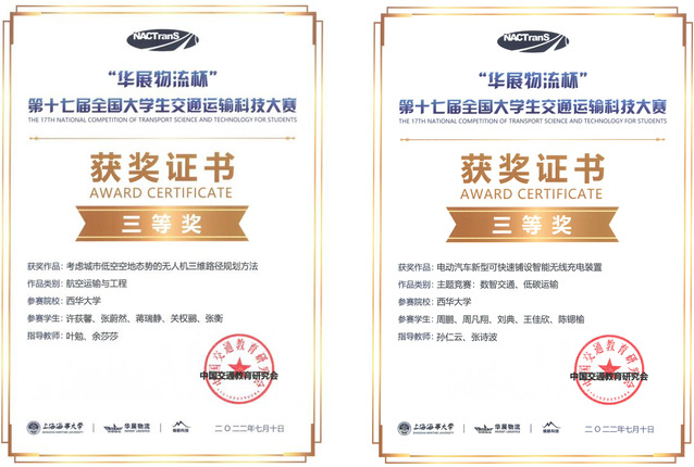本届大赛共有来自同济大学、东南大学、北京交通大学、西南交通大学等全国185所高校报名参赛,实际收到177所高校的1473件作品,最终共计93所高校206件作品进入决赛,决赛作品入围率仅为14%。大赛共产生一等奖作品37项、二等奖作品74项、三等奖作品101项以及优胜奖作品46项。西华大学共有12件作品参加本次比赛,经过老师的精心指导、同学们的不懈努力,最终,汽车与交通学院的周鹏、周凡翔、刘典、王佳欣、陈锶榆同学在孙仁云、张诗波老师的指导下,作品《电动汽车新型可快速铺设智能无线充电装置》入围决赛并获得全国三等奖;航空航天学院许荻馨、张蔚然、蒋瑞静、关权鹂、张衡同学在指导教师叶勉、余莎莎的带领下,作品《考虑城市低空空地态势的无人机三维路径规划方法》入围决赛并获得全国三等奖。