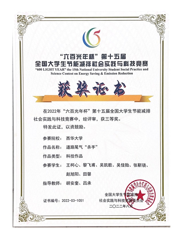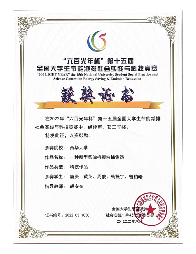 本届大赛自启动以来,吸引了包括清华大学、天津大学、厦门大学、哈尔滨工业大学等623所高校报名参加,其中还包括13所境外高校,有效作品达6218件。我校参赛作品历经校赛选拔脱颖而出,共有15个项目代表西华大学参加国赛,最终由能源于动力工程学院张焕敏、王希老师指导,黄子豪、黎飞甫、洪艺芳、叶佳明、杨渤、陈秋宇同学参与设计的作品《一种风浪混合螺旋海上发电平台》获全国三等奖;由能源与动力工程学院胡安奎老师指导,唐庚、黄英、周俊、杨振宇、曾柏皓同学参与设计的作品《一种新型柴油机颗粒捕集器》获全国三等奖;由能源与动力工程学院胡安奎老师指导,王柯心、黎飞甫、吴凯歌、吴佳贻、张靳骁、赵旭阳、田馨同学参与设计的作品《道路尾气“杀手”》获全国三等奖。