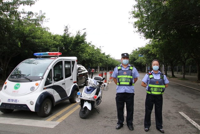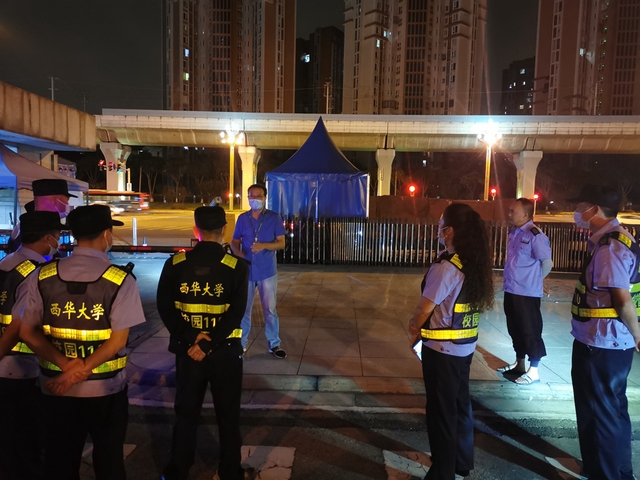 学校封闭管理当天,保卫处的校园安保工作就开启了“加强版”24小时不间断模式——校园门岗坚持24小时在岗值守,校内巡逻24小时不间断。保卫处干部24小时值守三班倒,安保人员两班轮换,严把“校门关”“围墙关”。在完成守护校园任务的同时,也查漏补缺,每日汇总各值班干部反馈的问题,及时排除疫情防控隐患,如增加西华南苑买菜卡标记出校日期和时间,定制进出校人员信息登记本,巡查围墙并将发现破损情况立即反馈基建处及时修补,同时安排保安队员在未修补好前专门盯守。巡逻队员在杂草密林丛中、河道工地旁昼警夜巡,晚间对校园内重点场所、重点楼栋进行安全巡查,24小时守护校园安全。