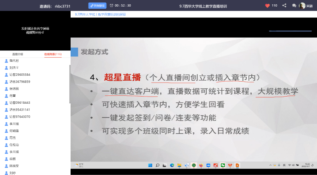 根据学校2022年秋季开学工作相关要求,为切实保障教学秩序,确保疫情防控形式下的教学工作平稳过渡,帮助我校教师有序开展2022年秋季学期教学工作,9月7日-8日,教务处(教师教学发展中心)组织开展了线上教学平台入门使用培训,邀请超星学习通、雨课堂2个专业教学平台的培训师对本学期有课程教学任务的教师进行培训,近200名教师参加了直播培训。