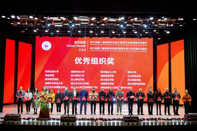 杨荔宣布获奖名单,在热烈的掌声中,获奖单位和选手上台展奖,并合影留念。获奖教师代表、西华大学音乐与舞蹈学院孙健表示,本次活动展示了师生卓越的专业技术水平、展示了教师良好的精神风貌和对音乐教育事业的挚爱和追求。