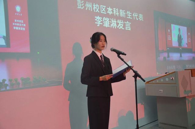 应急管理学院李肇淋作为彭州校区本科新生代表发言。她代表应急管理学院全体新生庄严承诺,将心无旁骛,求真学问、练真本领,秉持“知难而进、自强不息”的西华精神,不惧困难,勇往直前,做堪当大任的新时代应急人。