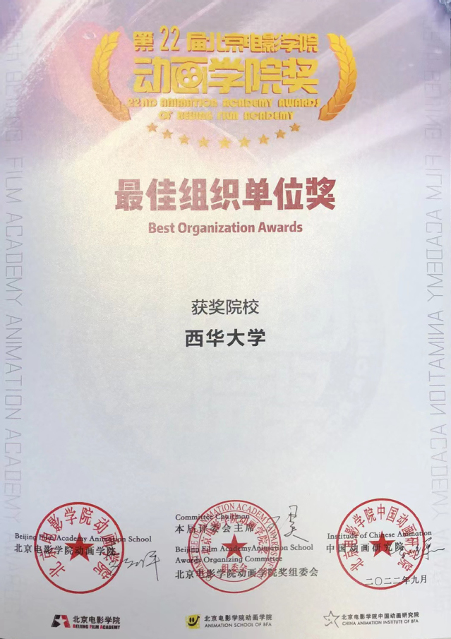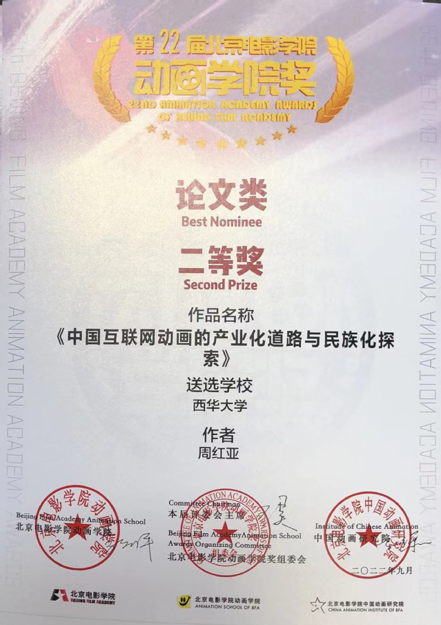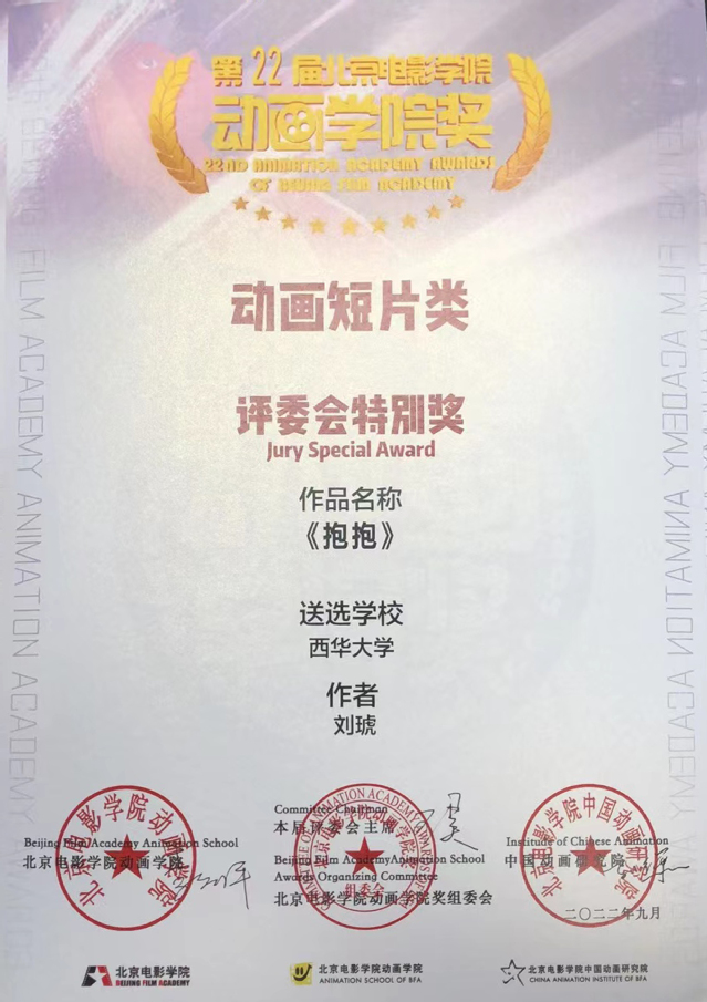 近日,“第22届北京电影学院动画学院奖”在北京电影学院举行隆重的闭幕式暨颁奖典礼,我校师生在此次活动中获得多项佳绩。全校共有7部作品和论文入围本次评奖,获得8个奖项,其中,美术与设计学院动画系副教授刘琥的动画作品《抱抱》获评委会特别奖,动画短片《航空梦》《大运三国志》获入围奖;周红亚副教授的论文《中国互联网动画的产业化道路与民族化探索》获论文类二等奖;赵春老师的论文《国产儿童动画的民族化演进与时代创新》获论文类三等奖;学生秦子涵的作品《融融》获优秀学生作业奖, 学生喻亲婷的论文《不认命就是哪吒的命》获入围奖。西华大学获最佳组织单位奖。