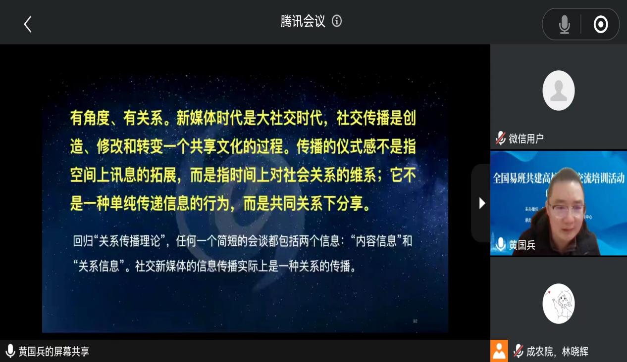 11月30日下午,四川省教育厅新媒体内容主编、教育部“星火计划”联盟单位骨干成员、微博大学训练营讲师黄国兵应邀作以“破壁者,这个时代的网络思政教育探索”为主题的专题讲座。他结合高校具体案例,指出面对Z时代、圈层化社交时代,思政教育工作者应该关注年轻人的诉求。他表示新媒体运营者要做到“四懂”:懂要求、懂平台、懂舆论、懂传播。他建议高校网络思政传播以及新媒体建设应该做到有温度、有深度,既要用青年话语体系、新颖活泼的形式,展现高校学子的生活状态,关注年轻群体感兴趣的话题,又要贴近学生实际,打造学生愿意看、愿意赞的网络思政文化,满足青年学生成长发展的需求和期待,确保高校网络思政和新媒体宣传工作常做常新。