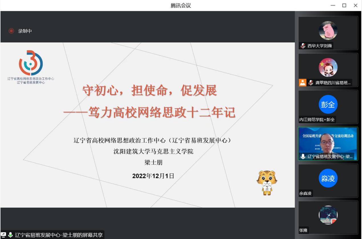12月1日下午,辽宁省高校网络思想政治工作中心(辽宁省易班发展中心)副主任、沈阳建筑大学马克思主义学院副院长梁士朋以“守初心,担使命,促发展——笃力高校网络思政十二年记”为主题,主要分享了党的二十大与高校网络思政、辽宁大学生在线联盟建设时期、进入辽宁高校网络思想政治工作新时代以及工作感谢体会四个部分的内容。他首先从党的二十大报告中关于网络思政的有关论述入手,对比党的十八大报告、十九大报告与二十大报告对网络思政论述了分析,并结合自己在辽宁高校网络思政两个不同的阶段的工作,与参训学员们分享心得体会。