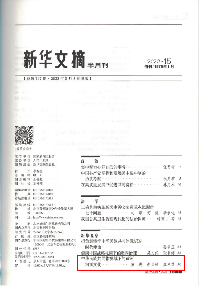 近日,《新华文摘》2022年第15期全文转载四川省社会科学院黄进研究员、李后强教授、廖冲绪研究员在《西华大学学报(哲学社会科学版)》2022年第2期发表的题为《中华民族共同体视域下的黄河河源文化》文章,这是我校学报哲社版刊文首次被《新华文摘》全文转载。