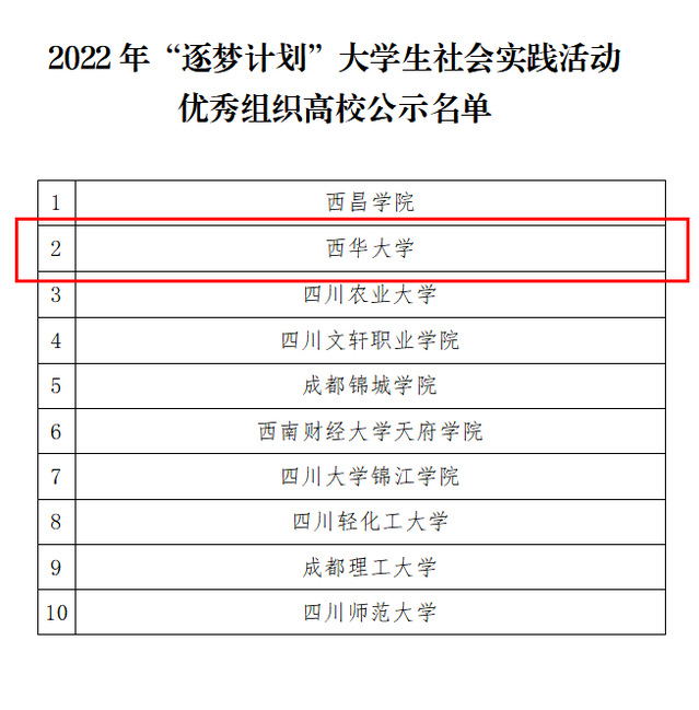 近日,团省委公布四川省2022年“逐梦计划”大学生社会实践活动优秀组织高校和优秀实习生评选结果。西华大学荣获优秀组织单位,全省仅十所高校获奖。毛雪花等六名同学荣获“优秀实习生”。
