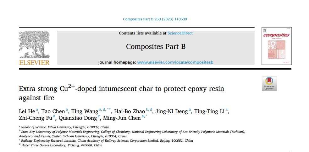 近日,理学院陈明军教授团队在Composites Part B: Engineering(复合材料领域TOP期刊,一区,IF=11.322)上发表题为“Extra strong Cu2+-doped intumescent char to protect epoxy resin against fire”的研究论文。该论文的第一作者为理学院2019级材料科学与工程专业硕士研究生何磊,通讯作者是理学院汪婷博士和陈明军教授。