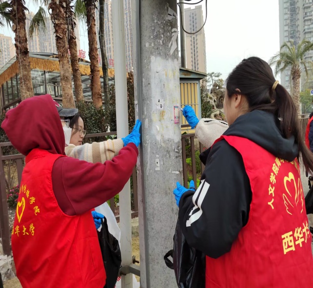 文学与新闻传播学院和航空航天学院青年志愿者服务队开展小广告铲除、白色垃圾清理、非机动车道共享单车摆放,维护城市市容市貌,美化学校周边环境。