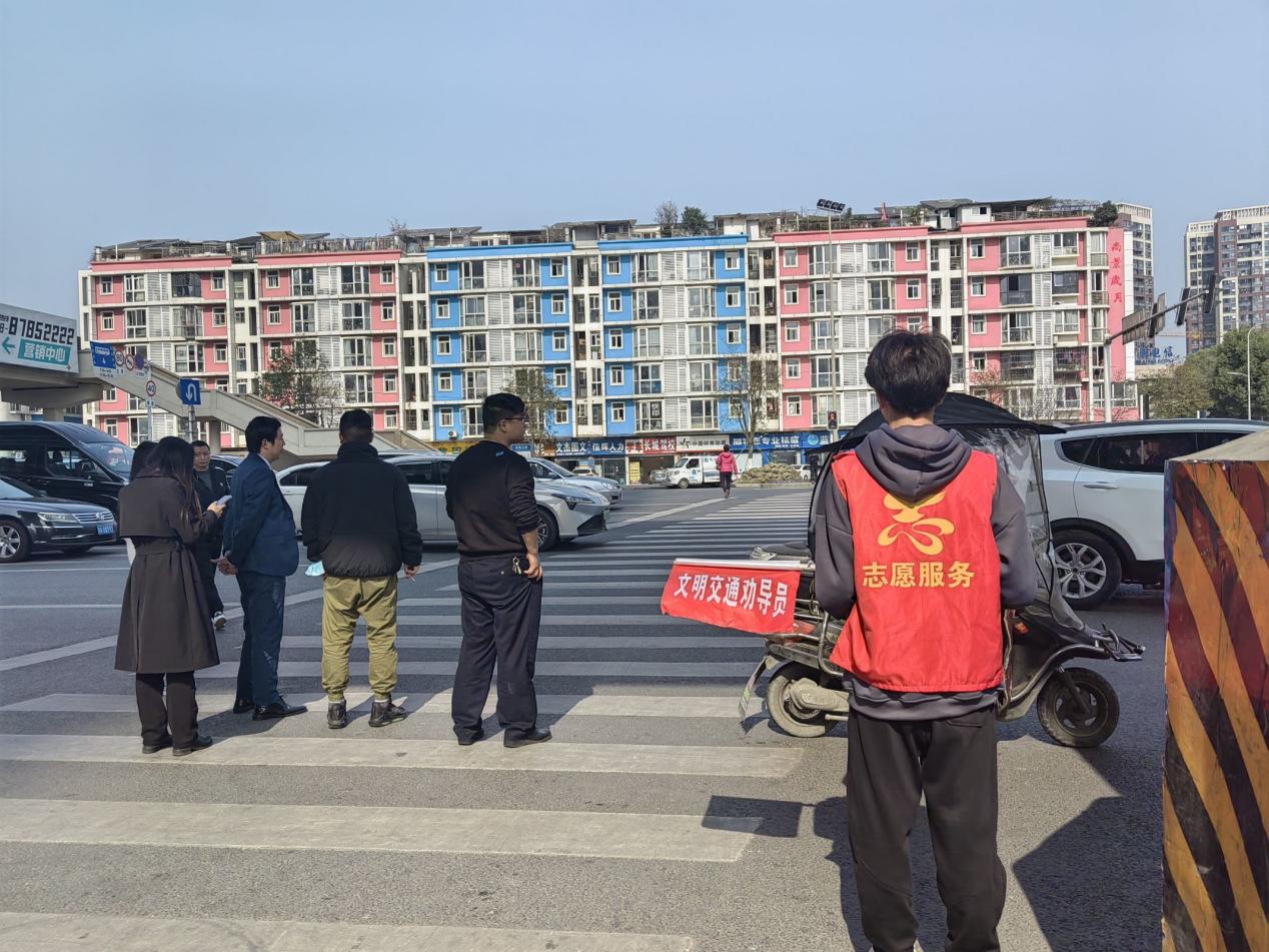机械工程学院青年志愿者服务队前往高店社区开展文明交通劝导志愿服务,配合交警指挥疏导交通,劝阻不文明交通行为,扶助行动不便者过马路,为安全出行、文明出行贡献力量。