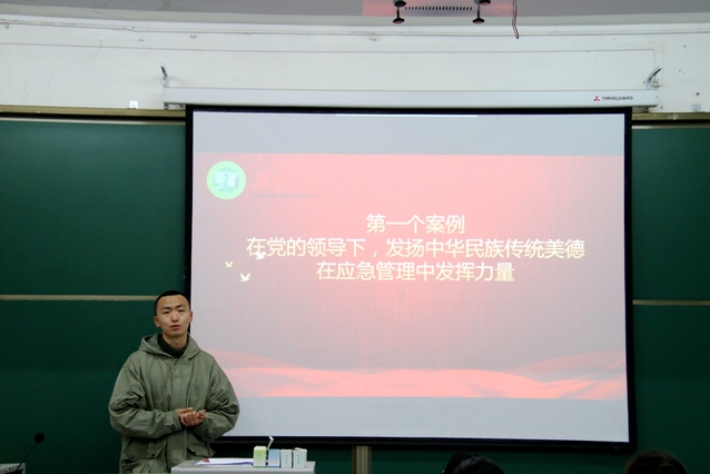 一段清晰而坚定的电话录音吸引了全班同学的侧耳细听,这是2021级应急管理专业的研究生富喆在分享他在新冠疫情期间主动担任社区志愿者的经历。作为2022年度“中国大学生自强之星”、西华大学“才达特别助学金”获得者,这位曾当过兵的“老学长”拥有丰富的应急志愿服务经历。“2020年乐山市发生818特大洪水,当时我看到抢险的解放军和武警,他们岁数还没有我当兵的时候大,我就想,难道我退役了,不是武警解放军了,就不能去了吗?于是我直接换了身军装,扛了把铁锹就去到灾区,加入社区的救援队伍……”