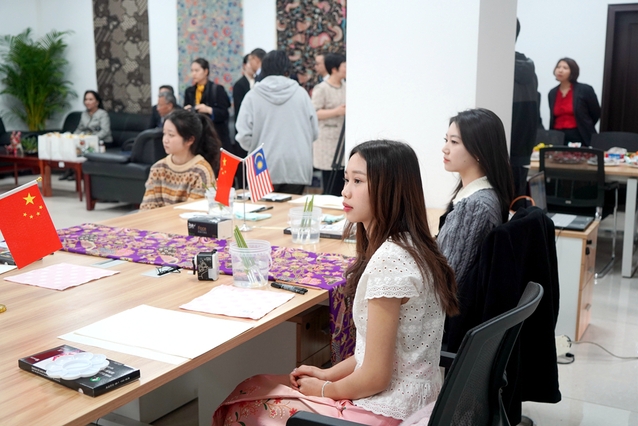 参观成果展后,嘉宾们参加了由印尼三一一大学孔子学院与西华大学美术与设计学院联合举办的“当印尼巴迪克艺术遇上中国传统纹样艺术”主题传统艺术工作坊活动。本次活动通过线上与线下相结合的方式,邀请了西华大学美术与设计学院副教授刘俊微及三一一大学艺术与设计学院Tiwi Bina Affanti教授担任活动主讲嘉宾。双方师生通过屏幕互相分享作品、鉴赏作品。西华大学学生将巴迪克花纹和色彩与中国仙鹤等纹样相结合,三一一大学学生将巴迪克纹样和中国阴阳鱼纹等纹样相融合,创作出许多具有创造性及蜡染纹样特色的设计作品。