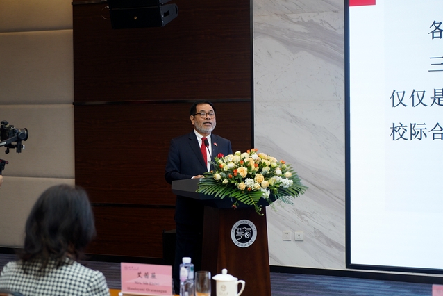 校长刘树根作开幕致辞。他首先代表学校对嘉宾的来访表示热烈欢迎,并感谢活动主办方为西华师生提供体验印尼文化、放眼看世界的宝贵机会。随后介绍了学校与印尼开展合作交流的情况。学校与印尼三一一大学于2019年3月共建三一一孔子学院,围绕国际中文教育、巴蜀与爪哇文化研究、中印尼两国经济、金融热点问题研究等领域开展了特色鲜明、富有成效的工作。两校以孔子学院为纽带,不断深化校际合作,共建了“爪哇—巴蜀文化研究中心”“国际教育海外实习基地”“国际经济与贸易研学基地”等合作平台。同时,刘校长介绍了刚结束对三一一大学访问的情况与取得的成效,在本次访问中,两校达成了进一步深化两校合作的共识,决定在科学研究、人才培养和人文交流方面务实推进项目合作,签署了共建科研国际合作中心协议、2+2本科人才联合培养协议以及专业学院合作协议。
