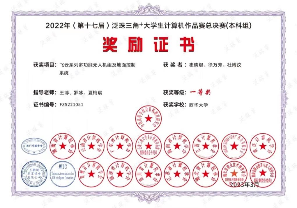 3月5日,西华大学参赛团队作品《飞云系列多功能无人机组及地面控制系统》(徐万芳、崔晓焜、杜博汶)在计算与软件工程学院老师罗冰、夏梅宸,经济学院老师王博指导下,在由全国高等学校计算机教育研究会及泛珠三角大学生计算机作品赛组委会共同主办的“2022年泛珠三角+大学生计算机作品赛总决赛”中获全国一等奖,总排名第二,并在本科组获唯一最佳创新奖。