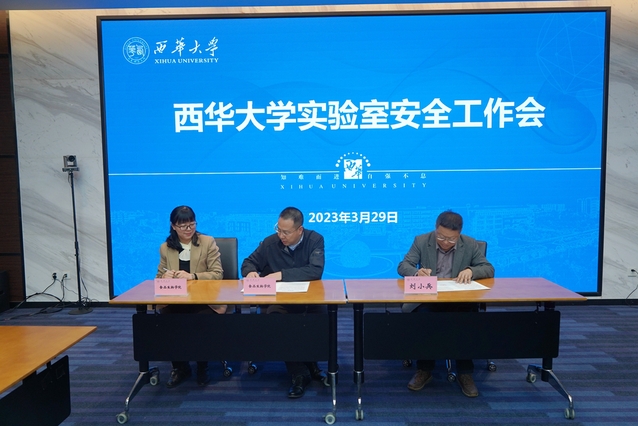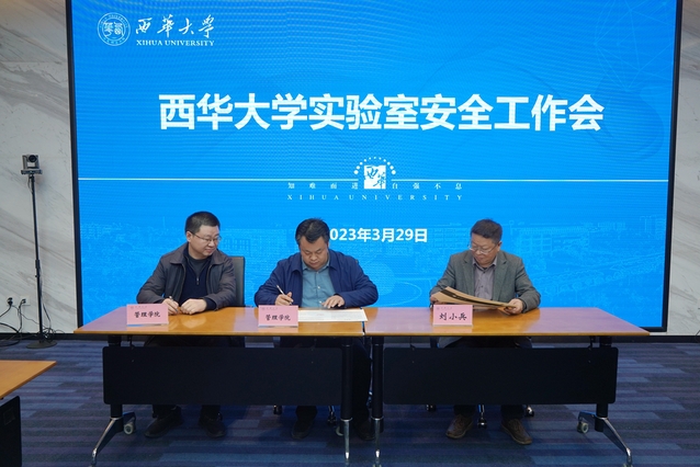 会议现场,副校长刘小兵代表学校分别学院代表——管理学院、食品与生物工程学院党政负责人签订了《西华大学实验室安全管理责任书》。