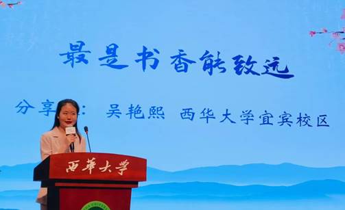 西华大学管理学院吴艳熙同学作为学生代表分享了自己的读书经历。她表示乘着书籍这艘战舰,打开了无数个新世界的大门,领略了无数道独特的风景,也从中获得打破人生的底气和超越自己的资本。在自身获益的同时,号召新时代青年朋友登上书籍战舰,翻开书本在青春赛道上奔跑,用阅读铺就光明未来。