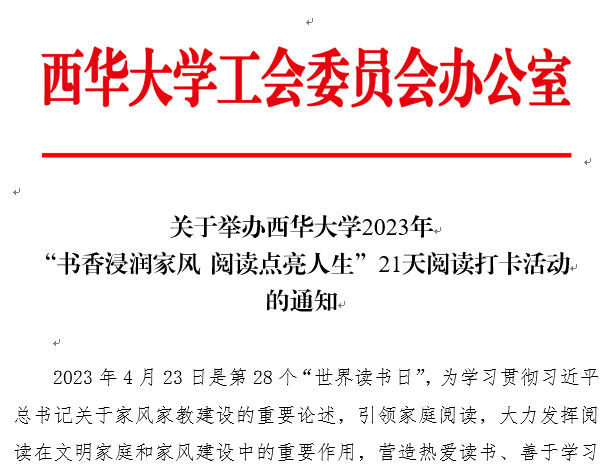 据悉,为学习贯彻习近平总书记关于家风家教建设的重要论述,引领家庭阅读,大力发挥阅读在文明家庭和家风建设中的重要作用,营造热爱读书、善于学习的氛围,让书籍走进教职工心灵,走进家庭生活,推动职工家庭形成爱国爱家、相亲相爱、向上向善、共建共享的家庭文明新风尚,近日,校工会于近日印发《关于举办西华大学2023年“书香浸润家风 阅读点亮人生”21天阅读打卡活动的通知》,举办2023年“书香浸润家风 阅读点亮人生” 21天阅读打卡活动,活动将于5月17日结束。