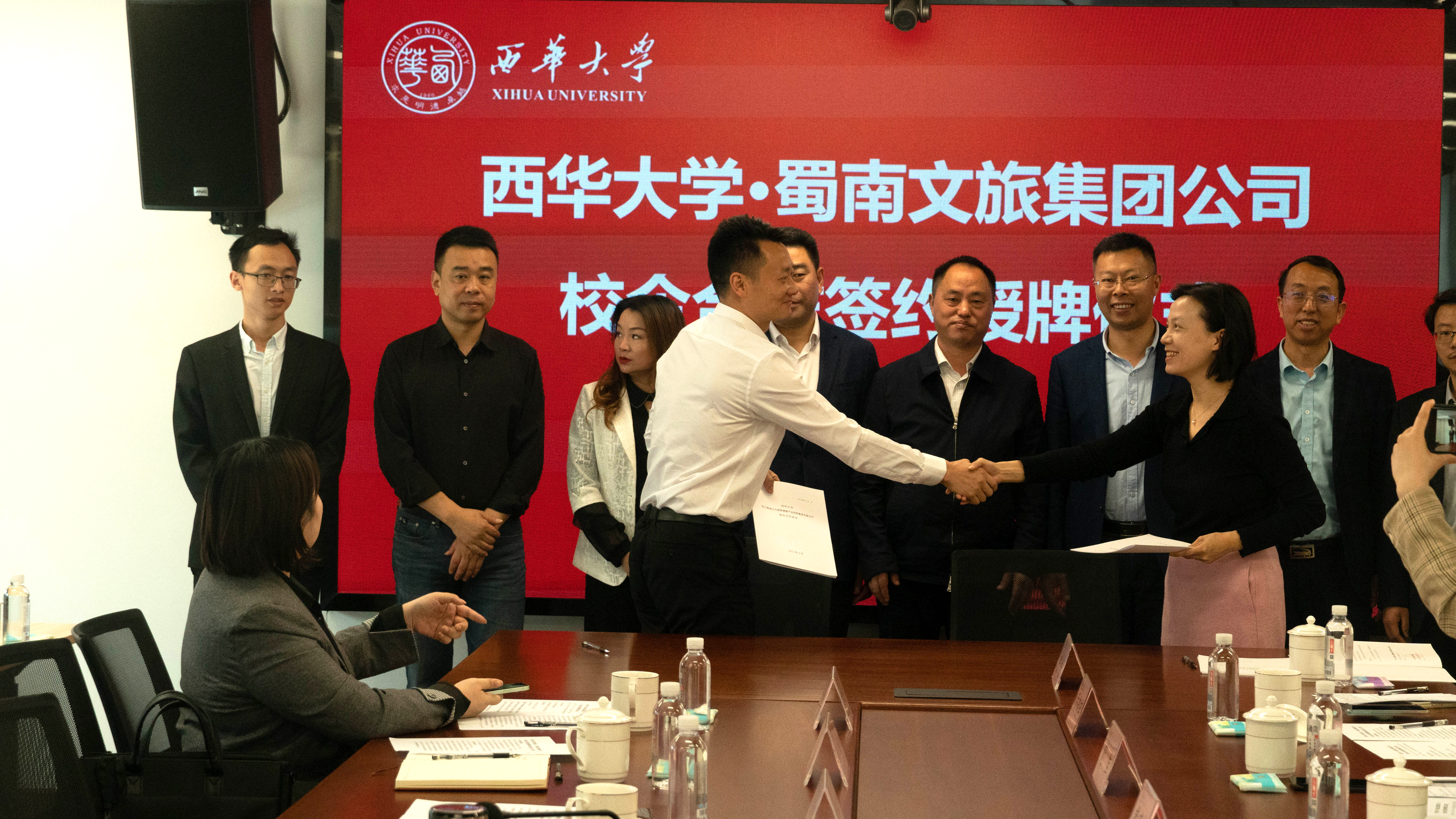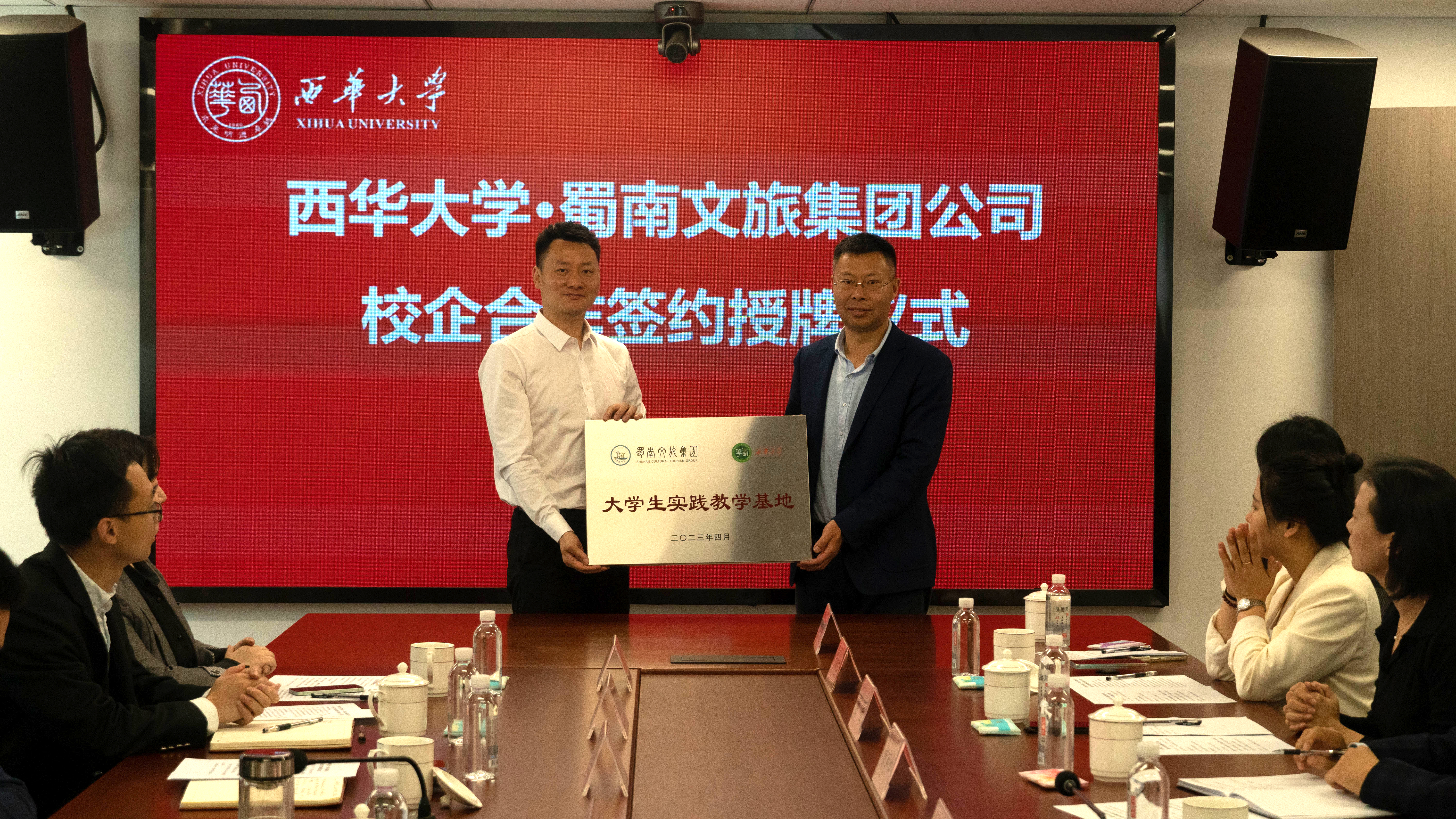4月25日上午,西华大学与蜀南文旅集团校企合作签约授牌仪式在宜宾校区举行。蜀南文旅集团党委书记罗景元、党委副书记朱福军一行,宜宾校区党工委(管委会)、文学与新闻传播学院等负责人出席授牌仪式。