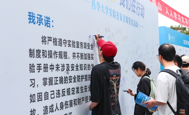 6月15日、16日,学校在明德广场开展实验安全知识宣传活动,通过标语横幅和桁架介绍实验室安全守则、消防安全、水电安全、化学安全、应急与救援、常用安全标识等知识,以此增强师生安全意识,凝聚安全共识。来往的同学们积极参与宣传活动,纷纷在签名墙中的实验室安全承诺书区域签下了自己的姓名。管理学院财务管理专业蔡广缘、罗艺轩同学作为志愿者在广场上发放实验安全知识宣传折页,他们表示:“我们想通过这样的方式,向不同专业同学普及实验室安全知识,进一步增强同学们的安全防范意识,更好地引导同学们学习安全知识、强化安全意识。”