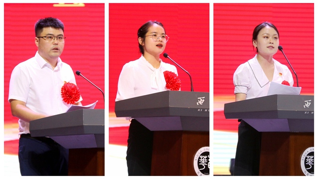 优秀共产党员代表、材料科学与工程学院袁乐,优秀党务工作者代表,马克思主义学院2020级研究生党支部书记梁玲云,先进基层党组织代表,理学院化学系教师党支部书记汪婷分别作为先进典型代表发言,他们立足自身岗位,从不同角度作了经验分享和成果汇报。