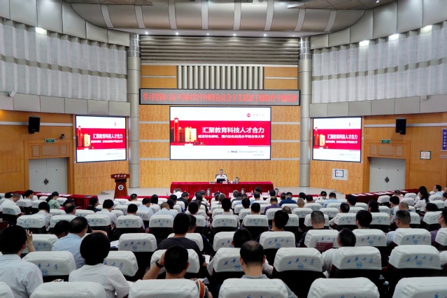 为扎实开展学习贯彻习近平新时代中国特色社会主义思想主题教育,以学铸魂、以学增智、以学正风、以学促干,7月7日上午,校党委副书记、校长李秋实以《汇聚教育科技人才合力建设特色鲜明、国内知名的高水平综合性大学》为题,在四教报告厅讲授主题教育专题党课。全体校领导、全体中层干部及相关职能部门全体党员参与学习。