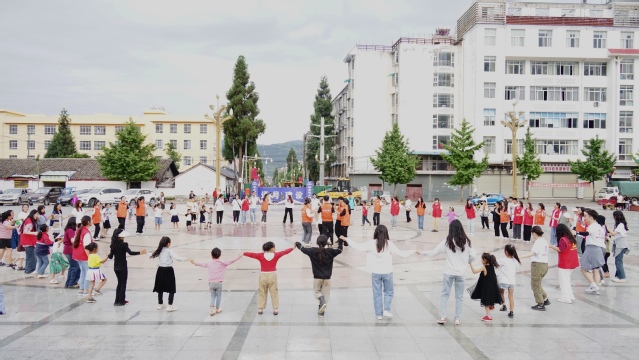 在昭觉县火把广场,实践队员与周边社区居民手挽手、心连心,欢快的唱着彝族歌曲,齐跳热情四溢的达体舞,奏响民族团结的主旋律。